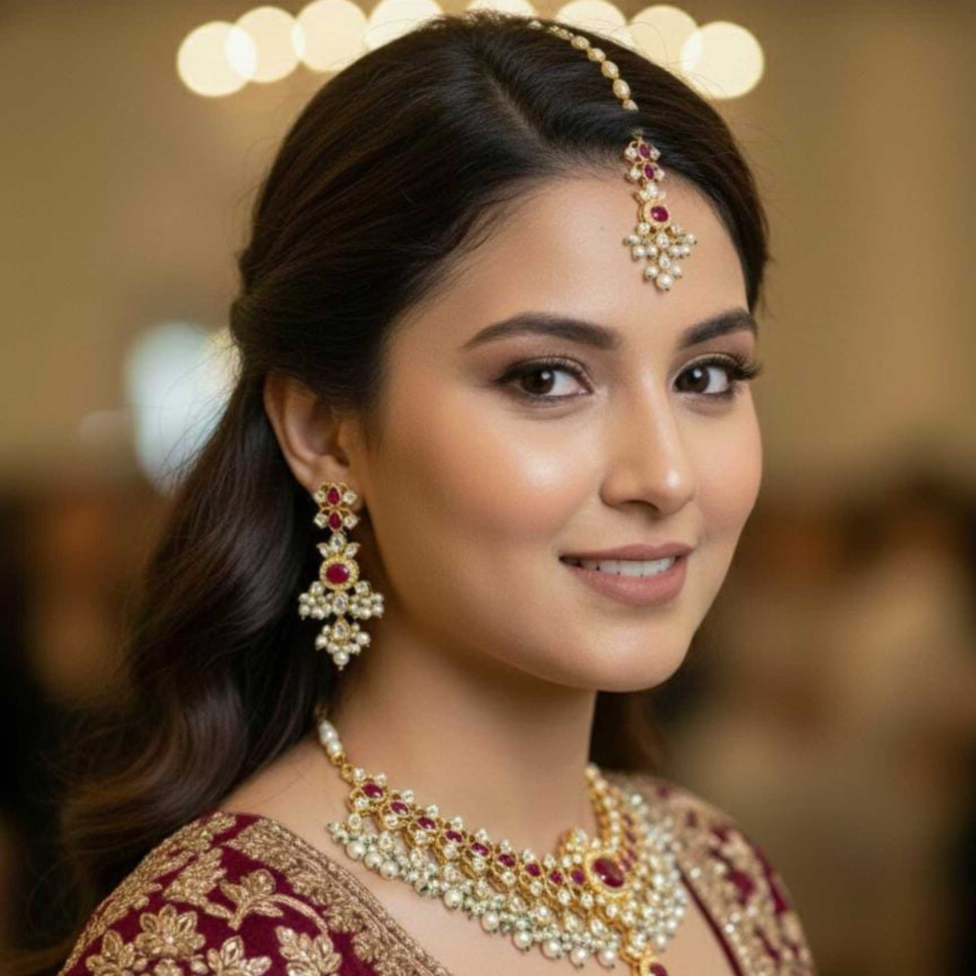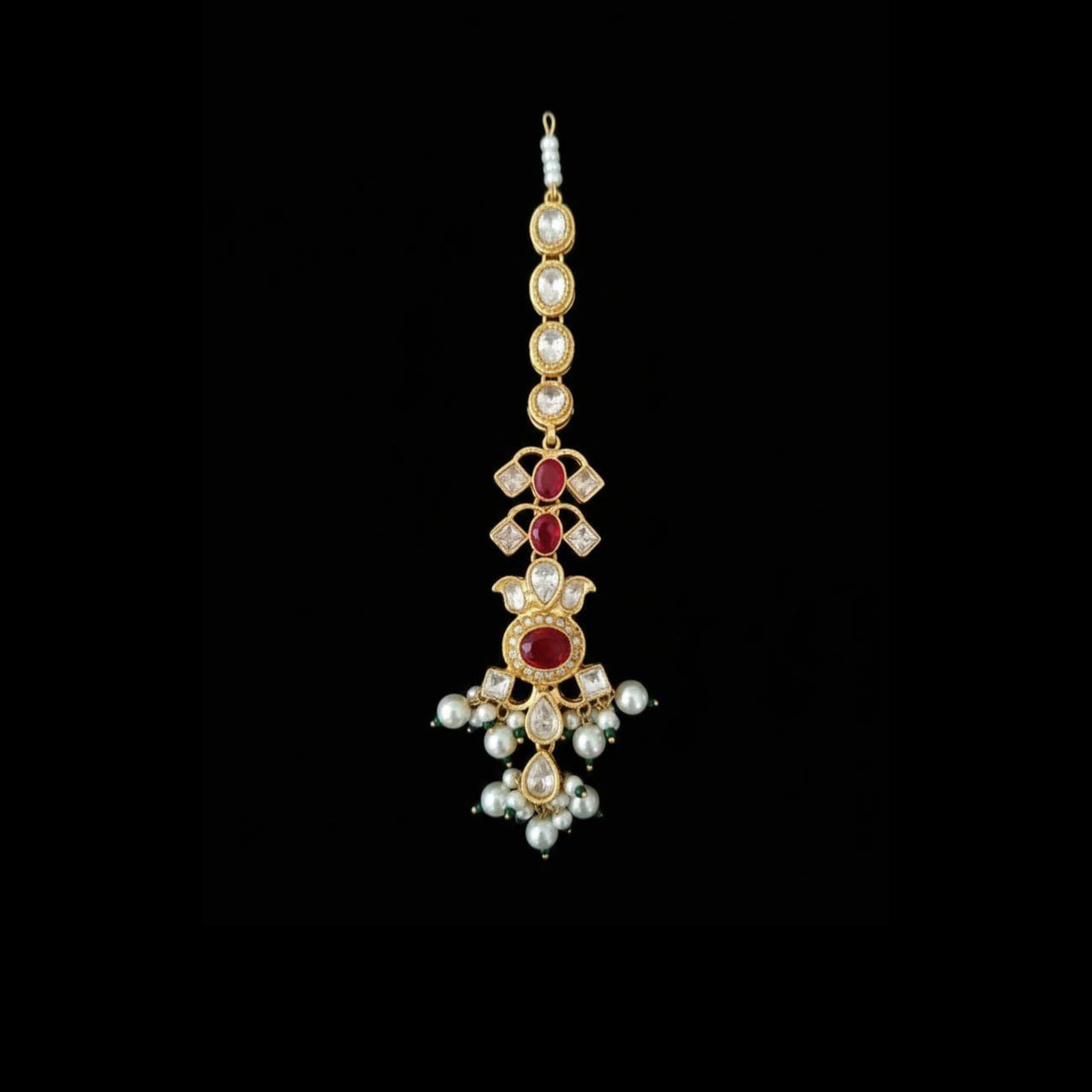 The Red Fayra Teeka is more than just an accessory—it's a symbol of timeless heritage and exquisite craftsmanship. With intricate design artistry, finished in sublime 22K real gold plating, it radiates elegance and prestige with every glance.