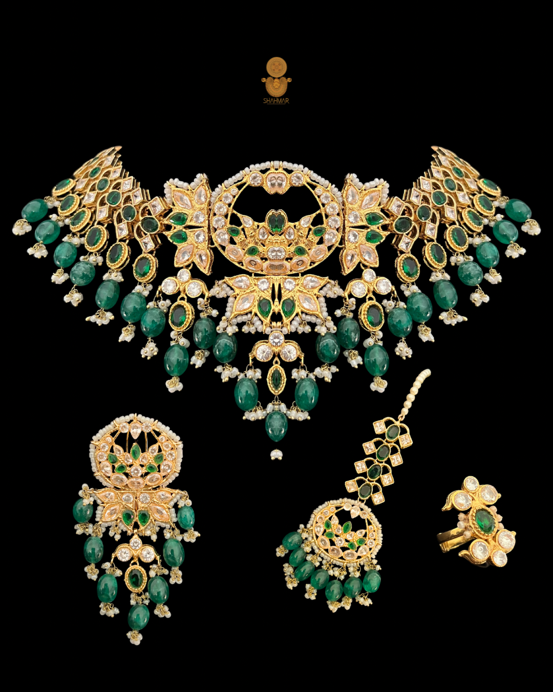 The Saija Set by Shahmar Jewels embodies regal elegance and timeless charm. Gold-plated and adorned with rich emerald-green stones, it captures the essence of heritage craftsmanship and modern sophistication. Each piece reflects intricate artistry — radiant, graceful, and unforgettable. Perfect for occasions that call for a statement of refined beauty.