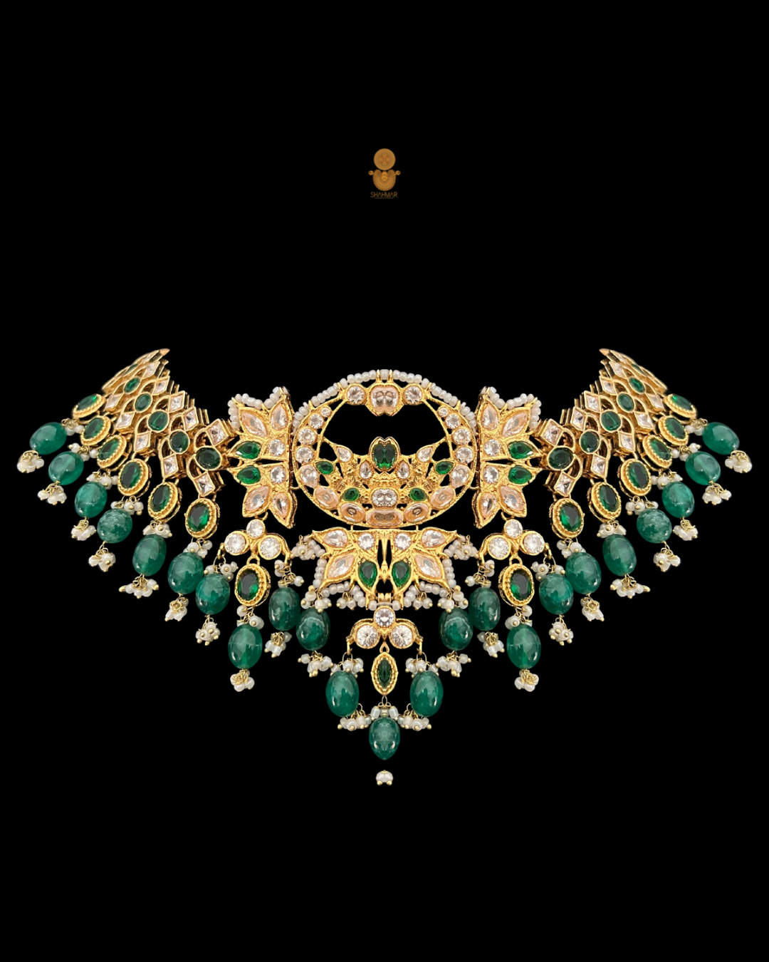 The Saija Necklace is the heart of timeless elegance — a gold-plated masterpiece adorned with deep emerald-green stones that shimmer with regal allure. Its intricate craftsmanship and graceful silhouette make it a true statement piece, radiating heritage and sophistication. Designed to rest beautifully along the neckline, it captures the essence of classic charm and modern luxury in perfect harmony.