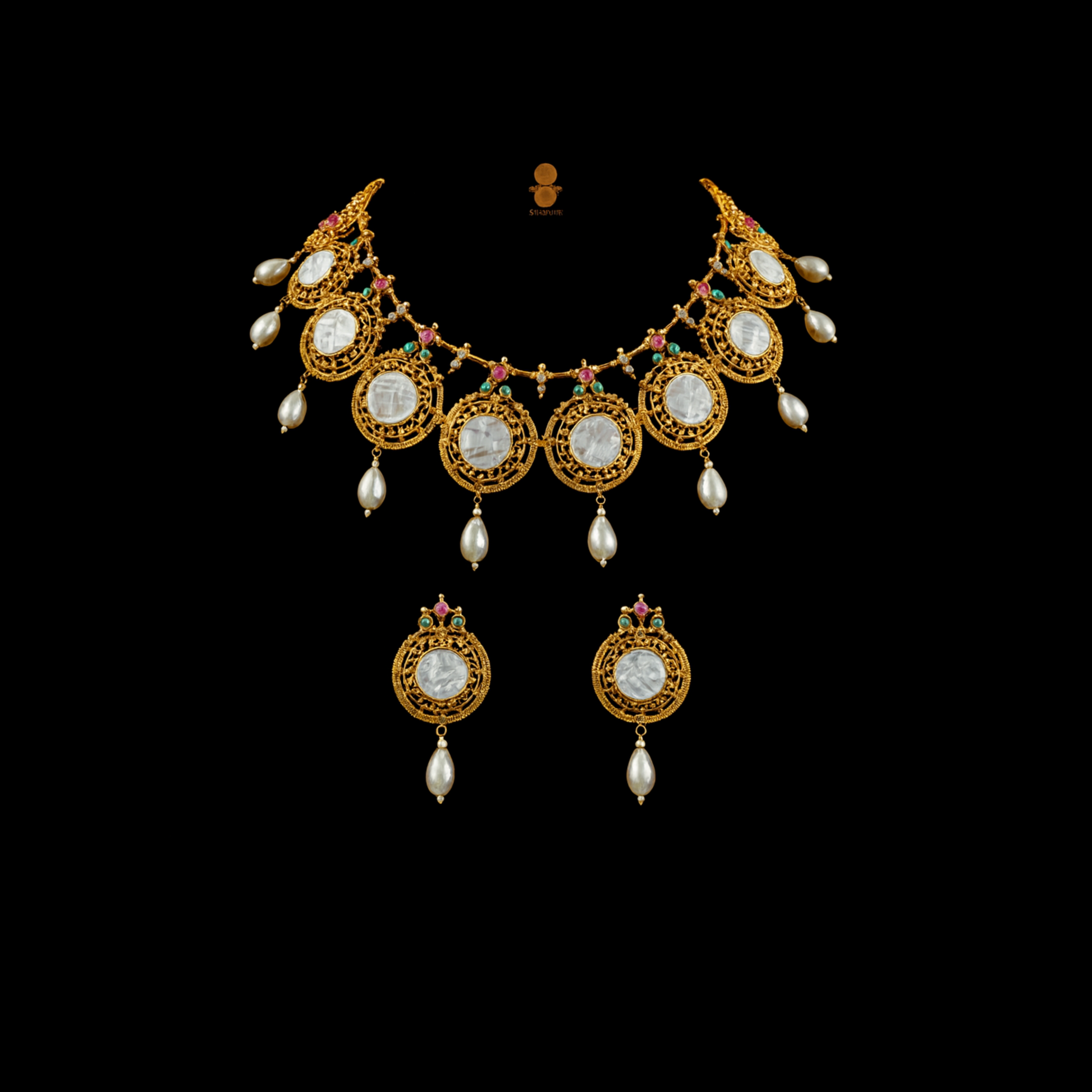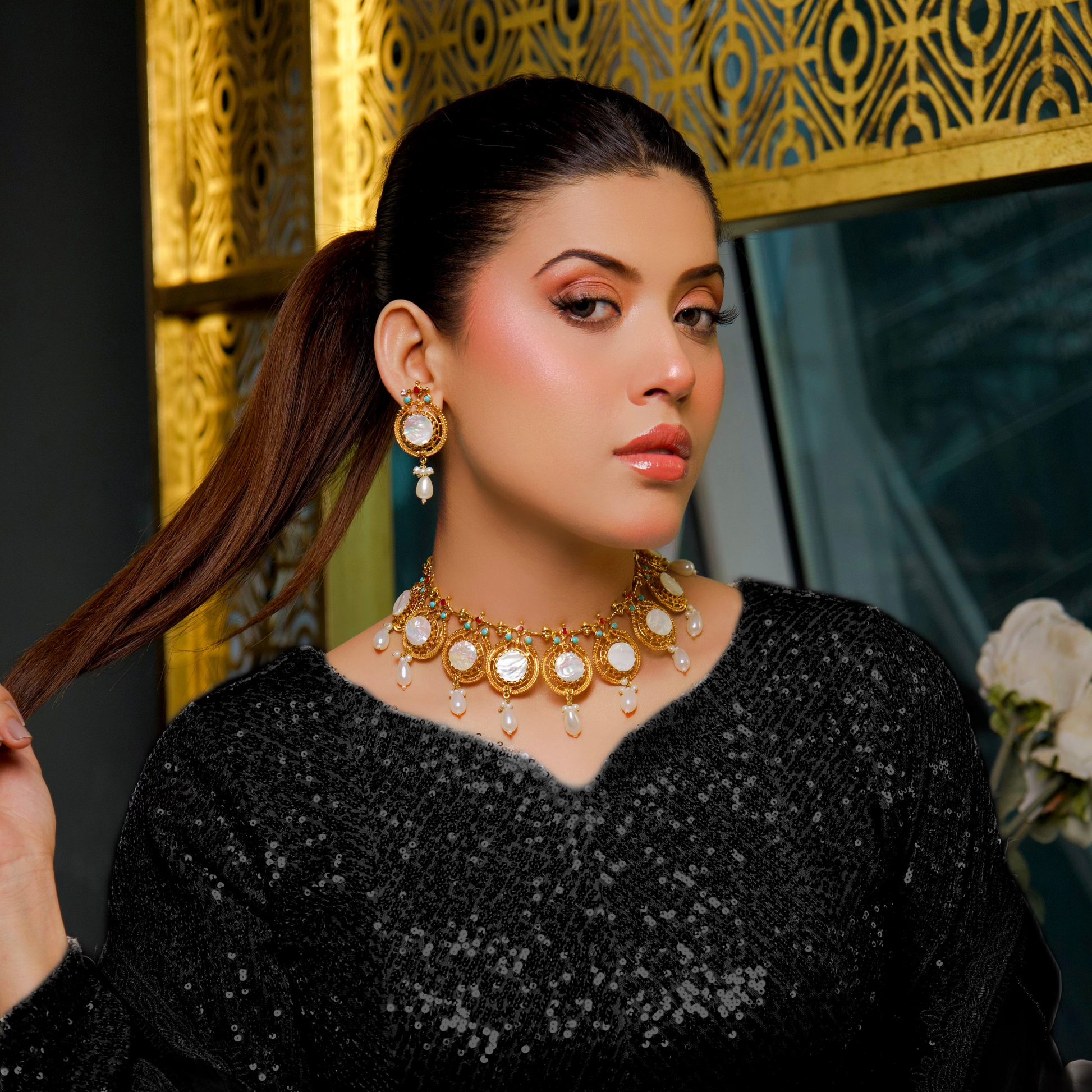 Introducing the Ayliz Set – the epitome of refined elegance. This luxurious 22K gold-plated necklace and earring duo is adorned with luminous white pearls, blending classic charm with modern sophistication.