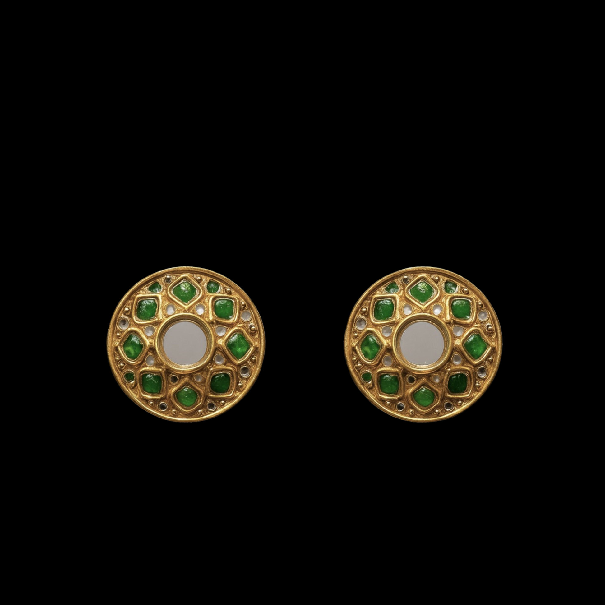 Chic and contemporary, the Gaspeite Earrings feature unique coin-shaped studs adorned with square-cut green stones and a stunning Kundan centerpiece. Their distinct shape and vibrant color make them a standout accessory for both everyday wear and special occasions.