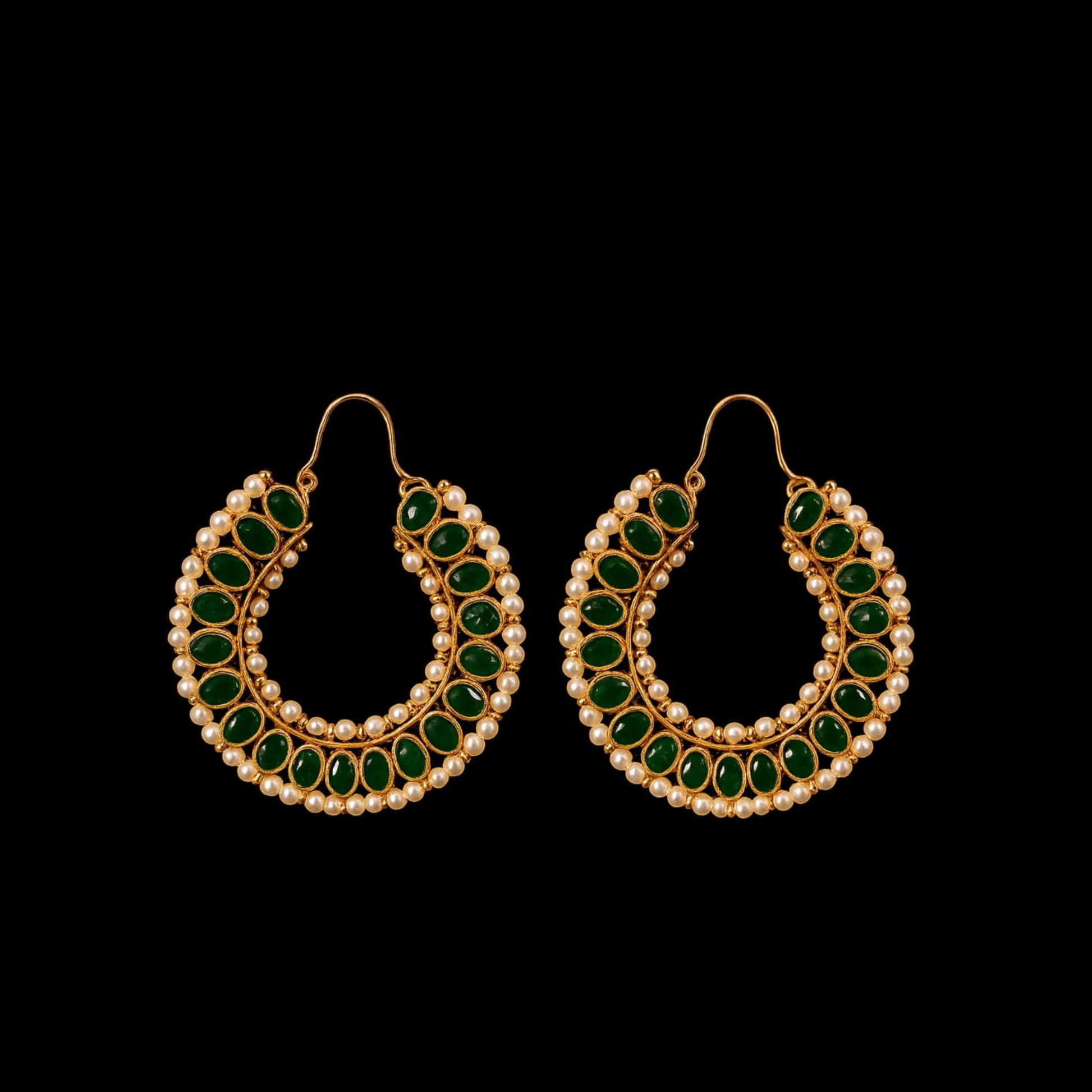 Timeless and elegant, the Green Bali Earrings feature precisely cut emerald-green stones beautifully set in a classic rounded gold structure. Their minimal yet bold design brings a perfect blend of tradition and modernity—ideal for festive wear or everyday glamour.